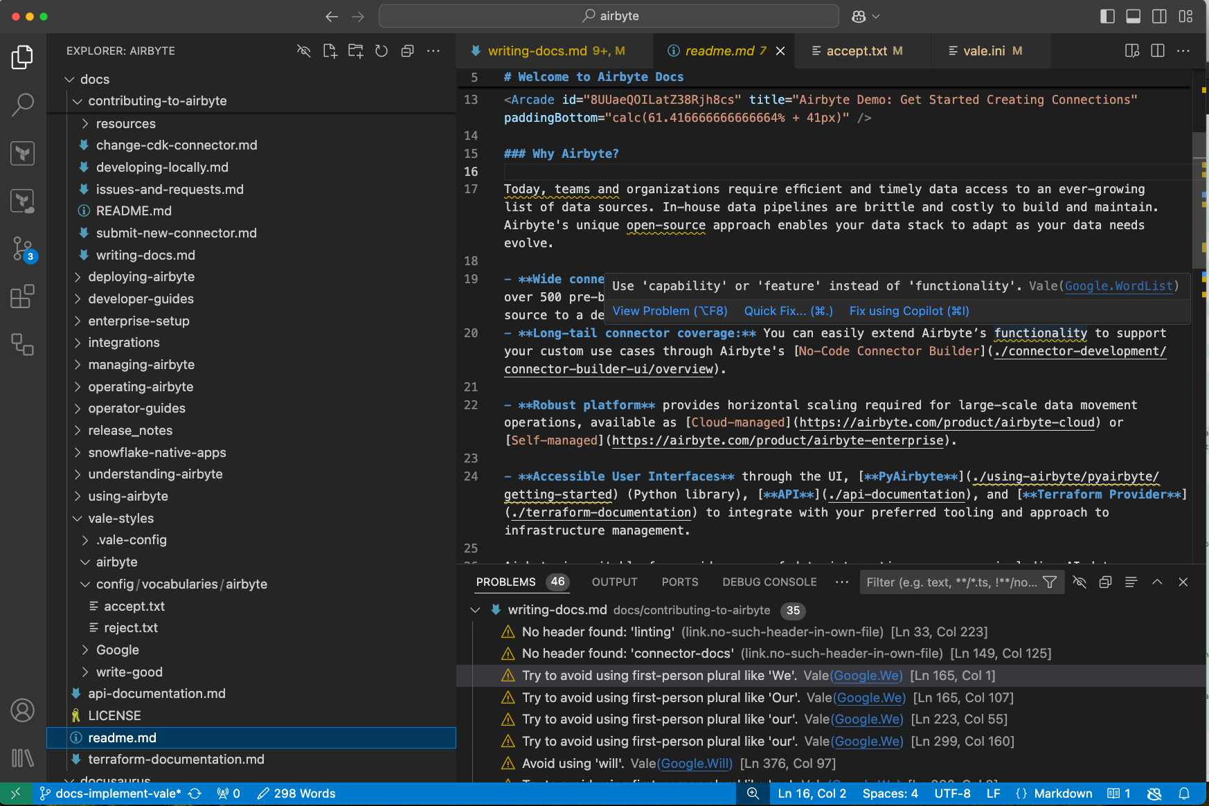 Airbyte uses Vale to promote standardization and minimum quality for docs content. Vale is an open source command-line tool that brings code-like linting to prose. It's not a general-purpose writing aid or an AI. It simply automates the identification of non-compliance with the style guide, principles for good writing, and other rules Airbyte defines as needed.